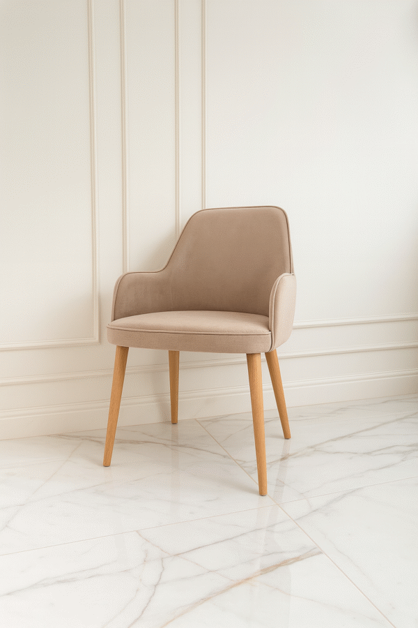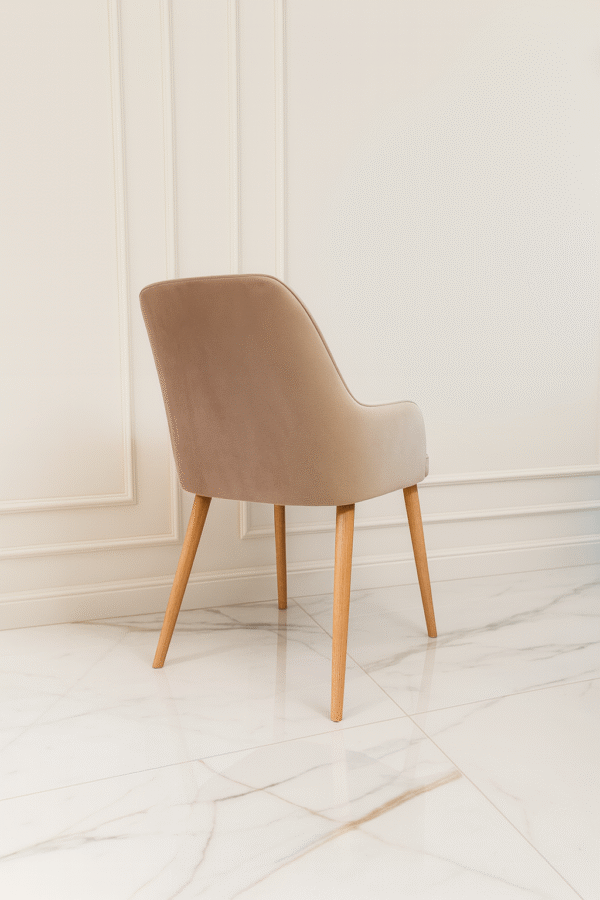 Nowoczesne krzesło tapicerowane miękkim welurem w eleganckim, ciepłym odcieniu beżu. Wygodne, zaokrąglone oparcie oraz delikatne podłokietniki zapewniają wysoki komfort użytkowania. Stabilne, drewniane nogi nadają konstrukcji lekkości i podkreślają skandynawski charakter mebla. Idealne do jadalni, salonu, biura lub toaletki.